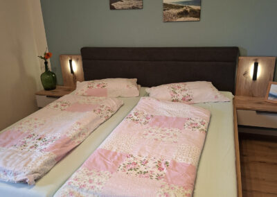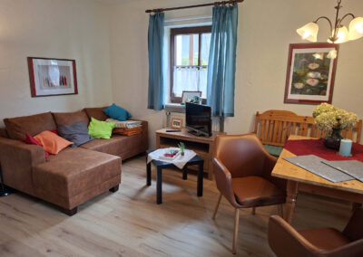 Unsere Ferienwohnung „Am Paradies“ wurde 2026 neu gestaltet und bietet auf ca. 55 qm viel Platz für erholsame Urlaubstage. Sie verfügt über ein Schlafzimmer mit Doppelbett, Einzelbett und Kinderbettchen. Ein Zustellbett ist bei Bedarf jederzeit möglich. Die gemütliche Wohnküche ist mit Ledercouch, Massivholzmöbeln, Digital-TV und Stereoanlage ausgestattet. Das Badezimmer verfügt über Wanne, Dusche und WC.